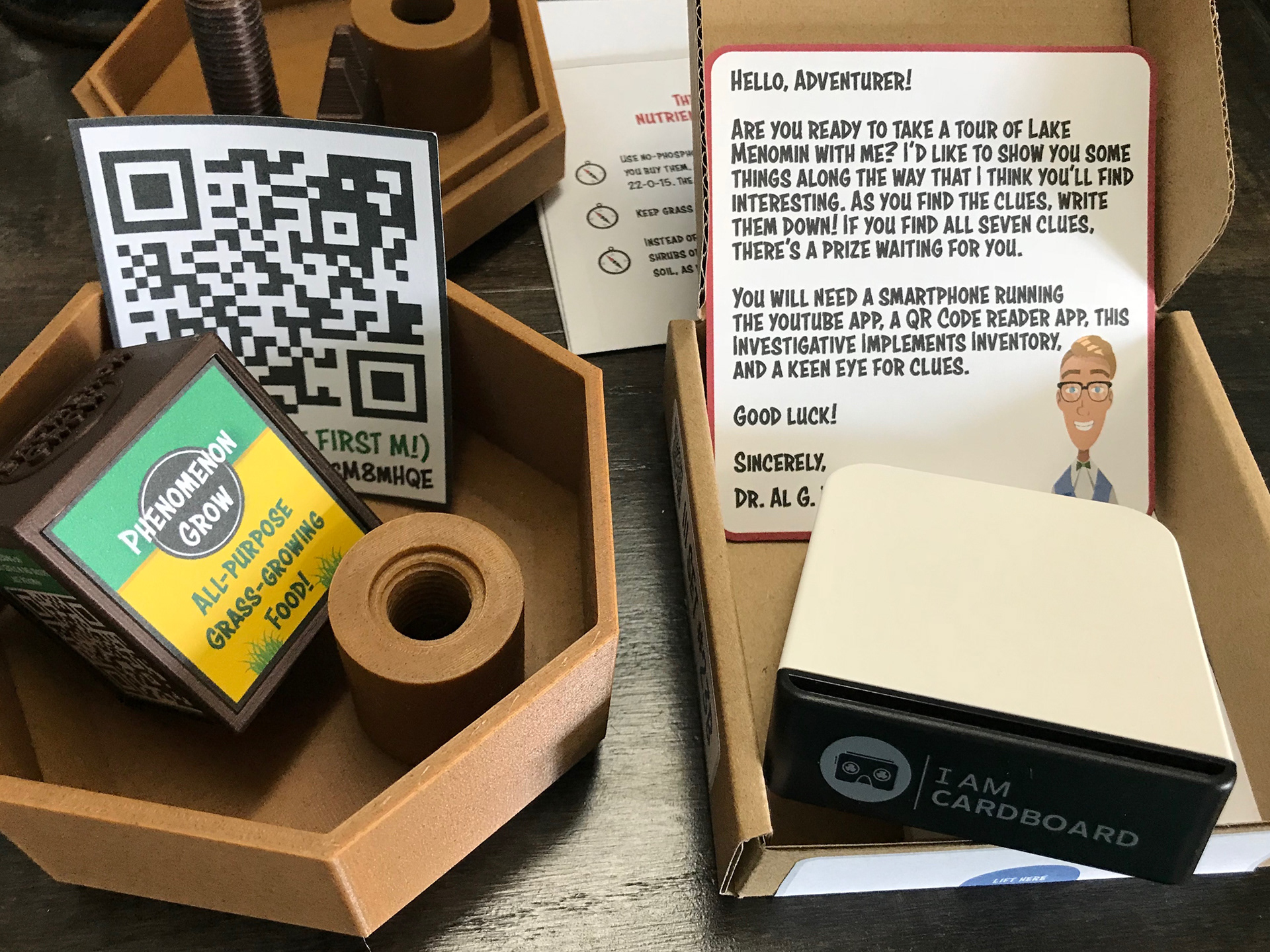 This is a project I designed based on generative design research, Spring 2018. After studying the Lake Menomin/Red Cedar water quality issue, I met with a small group to collage ideas for learning about it. Based on these ideas, I developed this game-based learning experience. I designed the 3D file for the box, the graphics and puppet.