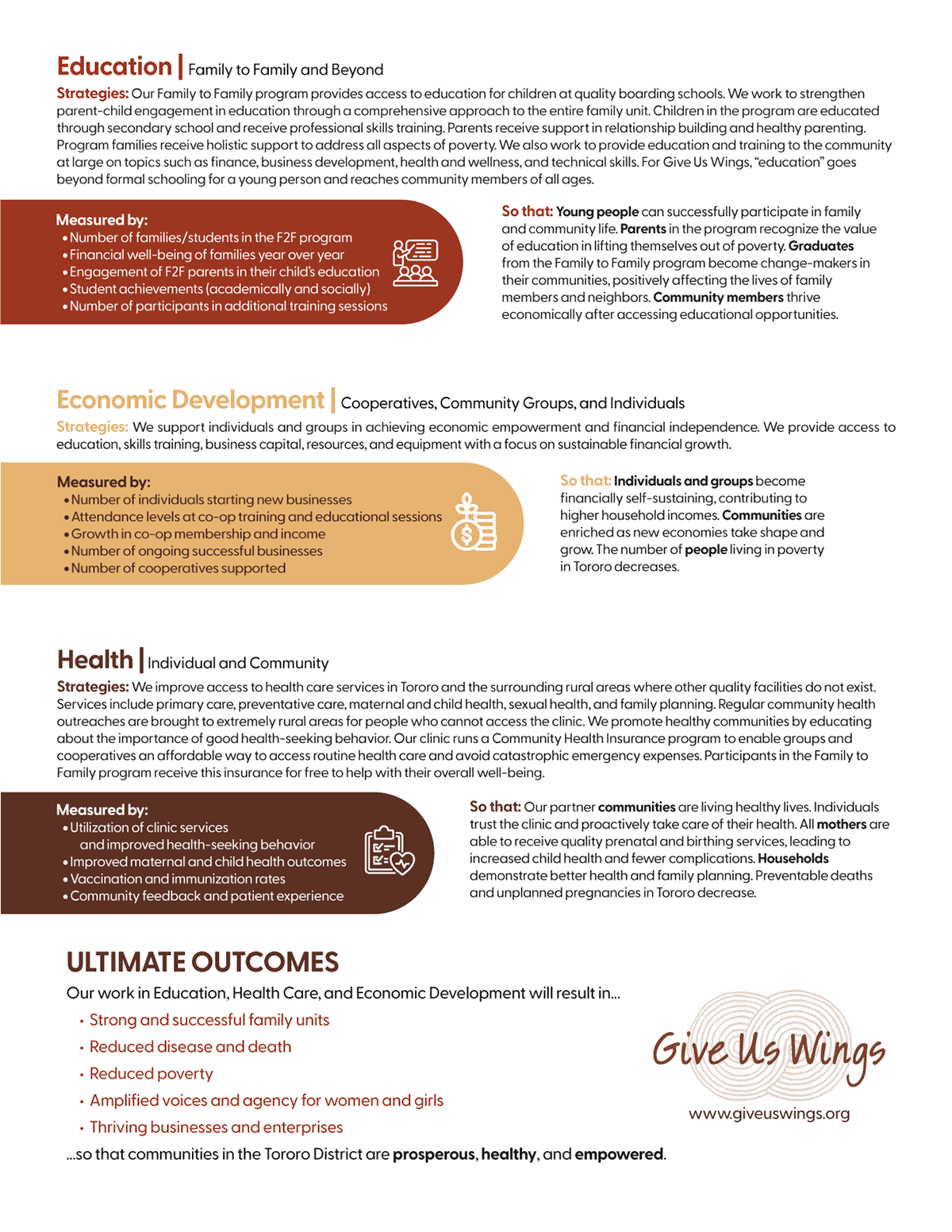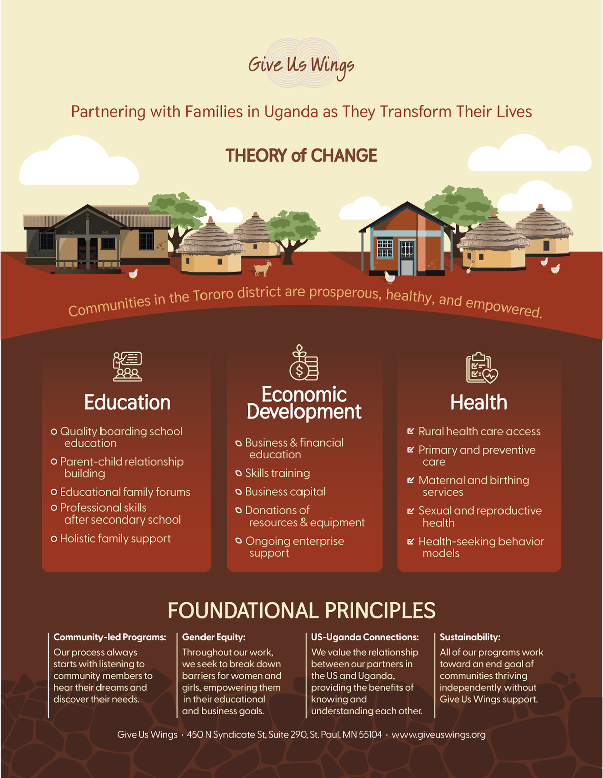 is an organization in St. Paul Minnesota partnering with families in Uganda. This one-page "Theory of Change" document was designed to outline the organization's vision and planning.