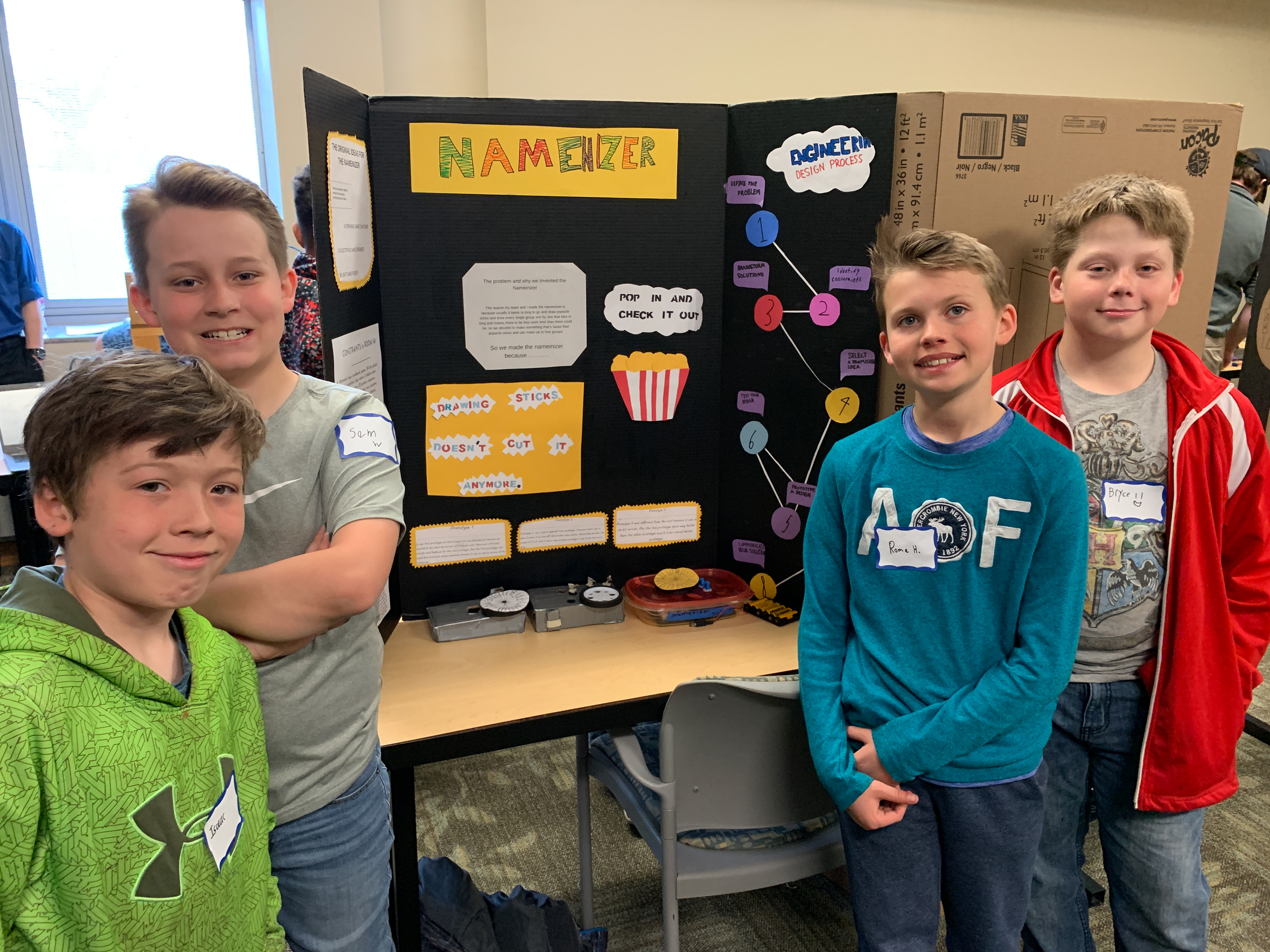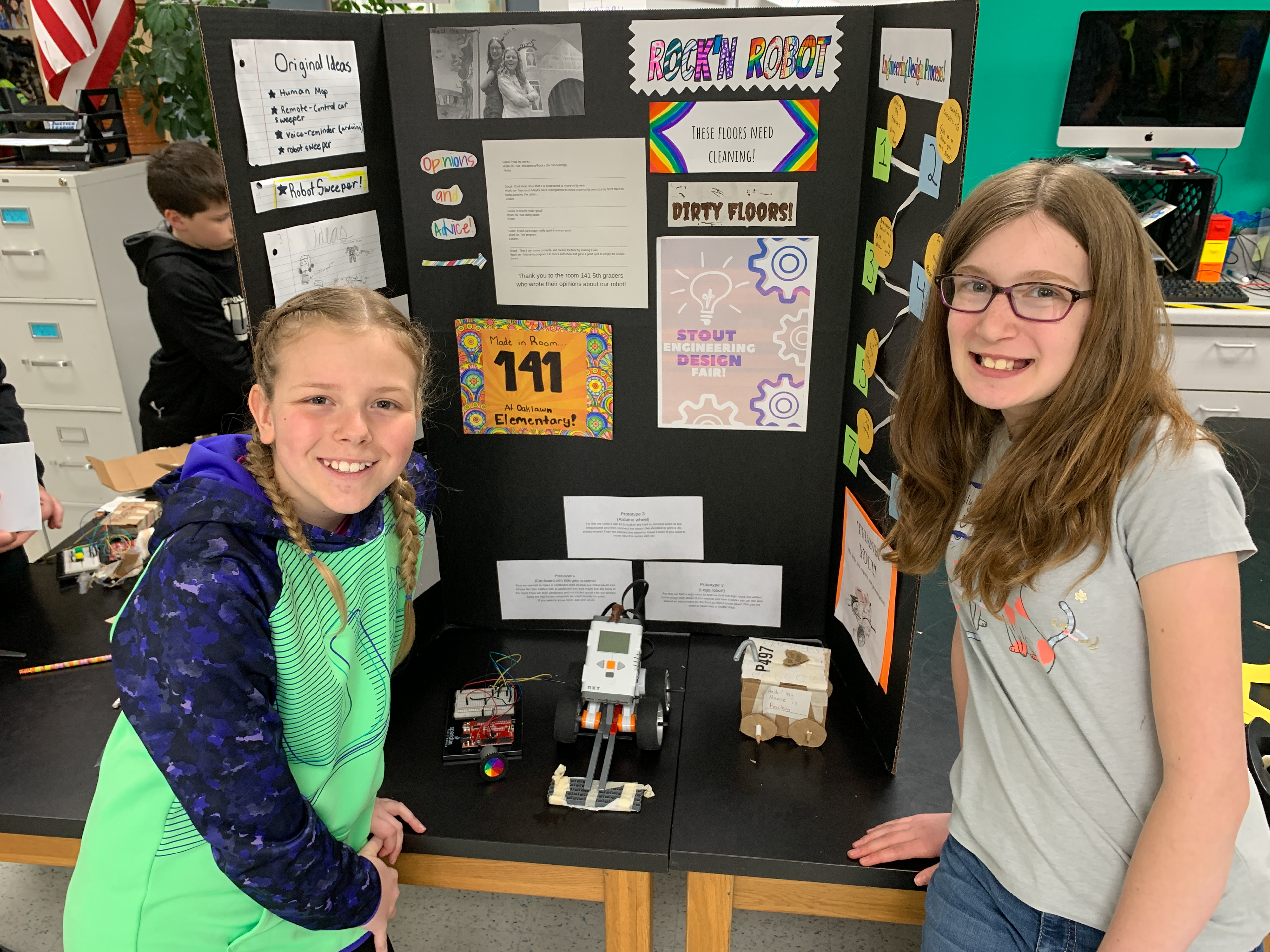 Partnering with UW-Stout's Engineering department, the 5th graders have learned to build and code Arduino boards and solve problems through invention. Below are several project examples shown at the annual university Research Day.Â